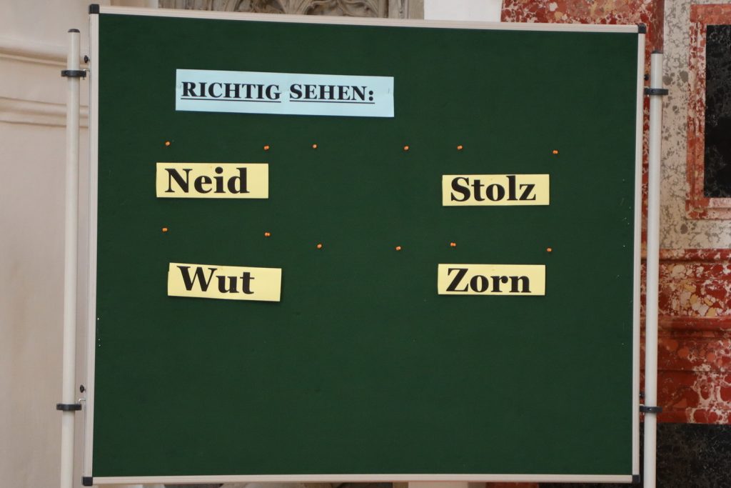 Mit einem Gottesdienst in der Stadtpfarrkirche begann das diesjährige Stiftungsfest der Kolpingsfamilie. Unter dem Leitwort „Richtig sehen“ wurde die Gemeinde gleich zu Beginn durch ein Anspiel in das Thema hineingenommen: Menschen waren vor lauter Neid, Stolz, Wut und Zorn blind für die Fakten